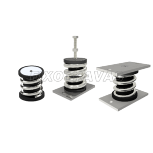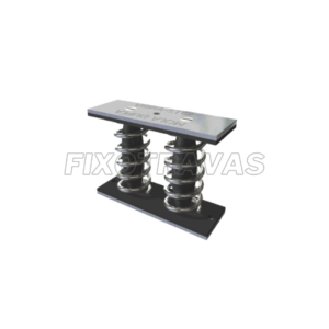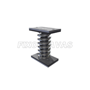 Amortecedor em mola e borracha com resistência à compressão, cisalhamento e tração. Ideal para transporte de equipamentos em veículos automotivos.